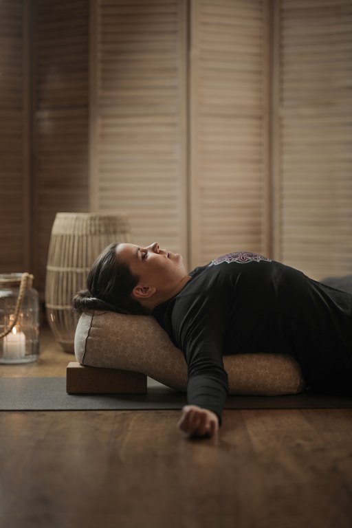 Jooga bolsterin (pitkulainen tyyny) ja 2 kpl joogatiiliä. Pärjäät myös erikokoisilla tyynyillä ja vilteillä.